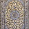 Скульптурное поле ковра представляет собой гармоничное сочетание гладкого золотого поля, сплетённого из позолоченных нитей и объёмного, шёлкового узора, переходящего в сплошную шёлковую кайму.