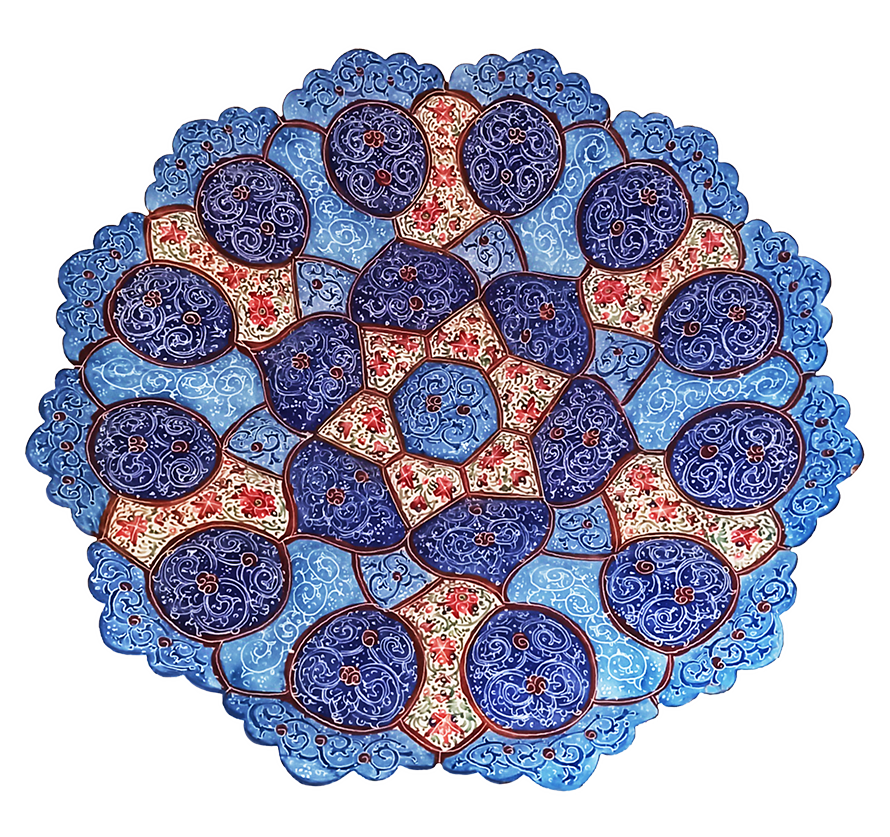Насладитесь гармонией восточного искусства в каждой детали! Эта медная тарелка ручной работы сочетает в себе нежность персидских мотивов и энергию страсти. Переливы бежевого, синего и голубого фона создают эффект утреннего неба, а изящные красные узоры, словно лепестки сакуры, добавляют композиции живости и характера.