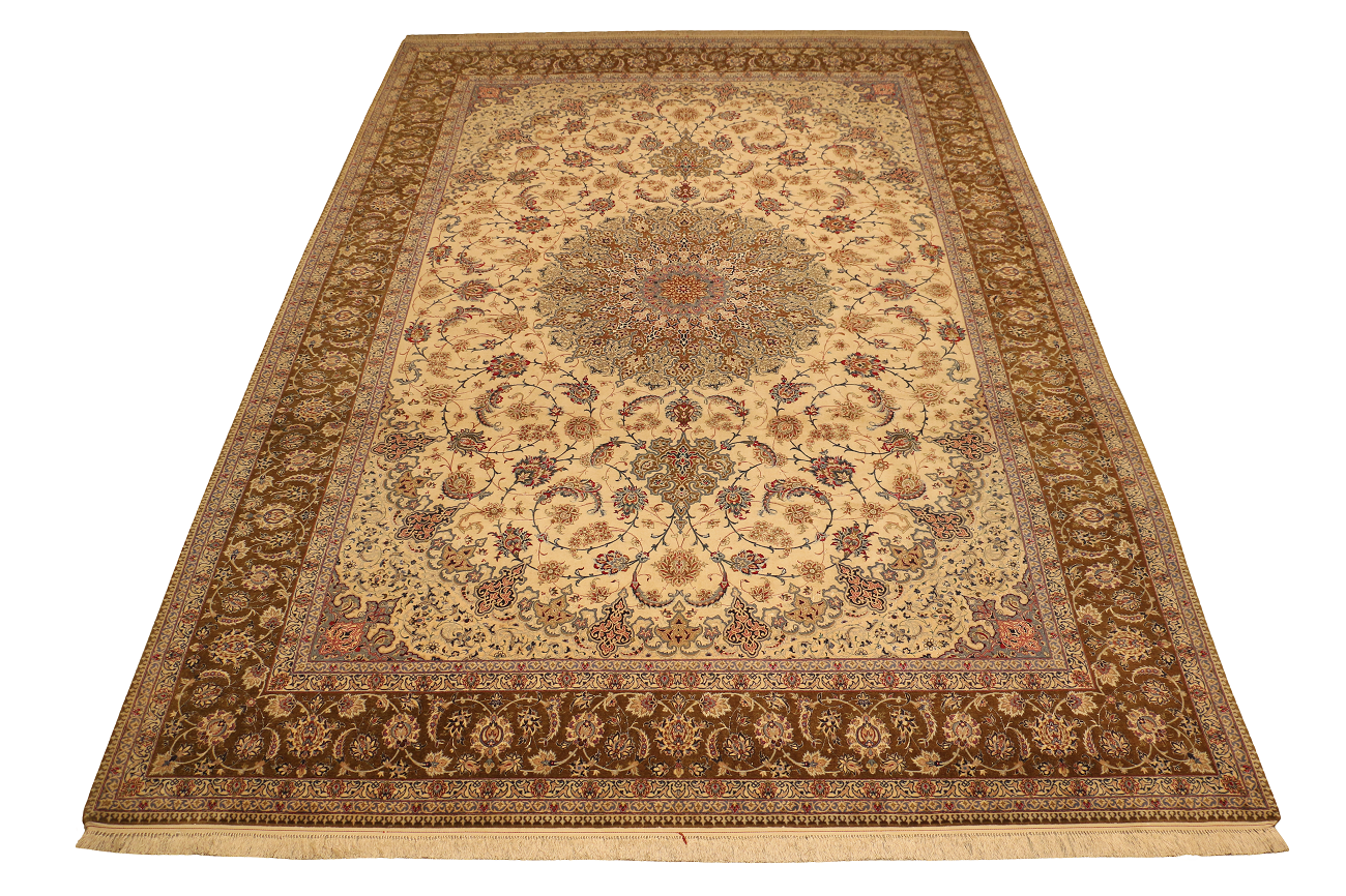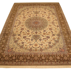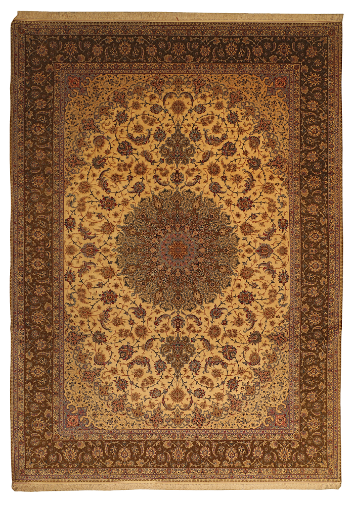 - Этот ковер — не просто изделие, а коллекционная редкость. Его главная особенность — уникальный, практически не встречающийся формат (4.48 x 3.23 м), создающий идеальную пропорцию для парадной гостиной. Выполненный в сердце Персии, в городе-музее Исфахане, он воплощает в себе эталон классики: безупречную гармонию бежево-кофейной палитры, тончайшую проработку узора и невероятную плотность в 810 000 узлов.