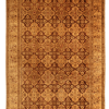 - Изящная коричневая кайма с ажурными бежевыми рисунками обрамляет ковер, словно драгоценная оправа, завершая художественный замысел.