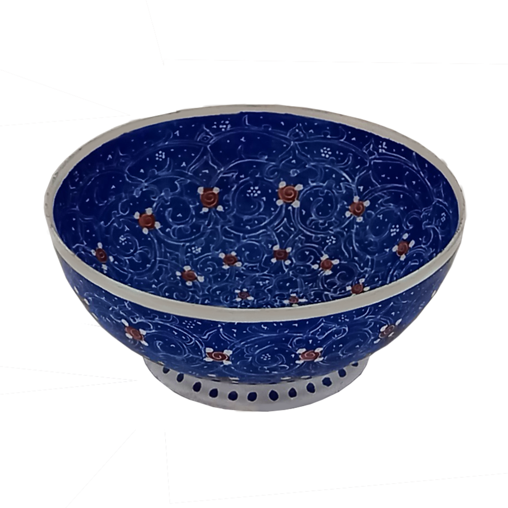 Эта пиала — не просто посуда, а воплощение вековых традиций иранских мастеров. Каждый завиток узора, нанесенный вручную, рассказывает историю древнего Исфахана — города, где искусство эмалирования и чеканки передается из поколения в поколение. Идеально круглая форма и гладкие стенки демонстрируют высочайшее качество работы, а благородное сочетание синего фона с белой окантовкой подчеркивает чистоту линий и изящество.