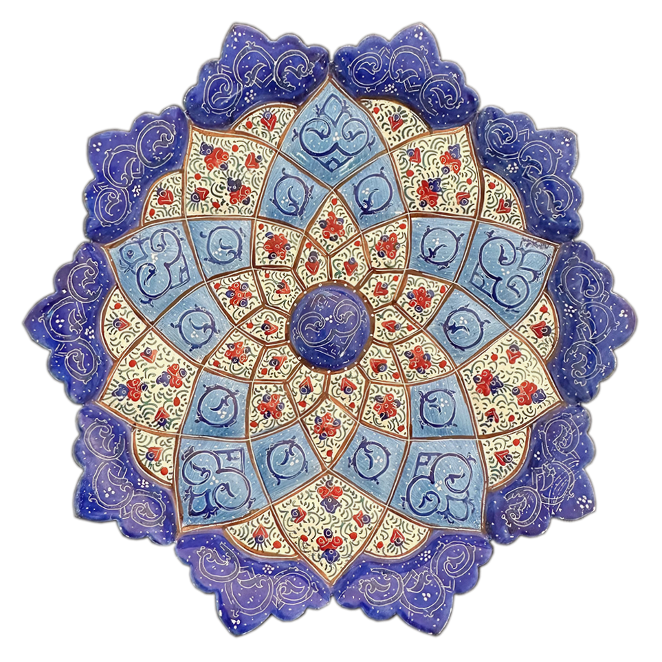 - СИМВОЛИЧНЫЙ УЗОР: в центре композиции — синяя сердцевина, от которой расходятся острые лепестки в бежевых и терракотовых тонах, напоминающие священный лотос или солнечный диск. Голубые лепестки с изящной синей росписью обрамлены изысканным синим бордюром с ажурным бежевым орнаментом.