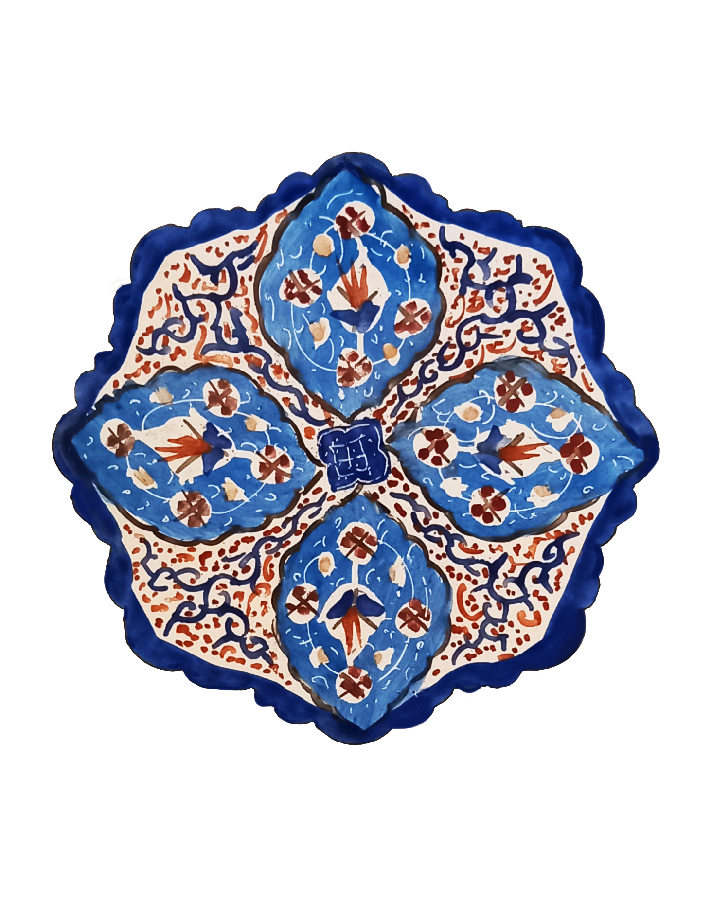 В этой изящной тарелке — вся философия Востока: четыре лепестка символизируют гармонию стихий, синий круг — бесконечность мироздания, а таинственные узоры — путеводные нити судьбы. Искусство, которое говорит с душой.