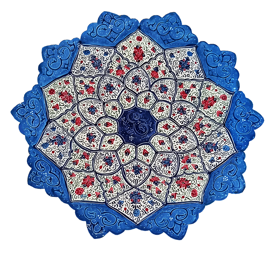 Эта эмалированная тарелка ручной работы — воплощение вековых традиций персидского прикладного искусства. Она выполнена из тонкой и легкой меди, что делает её изящной и удобной в использовании.