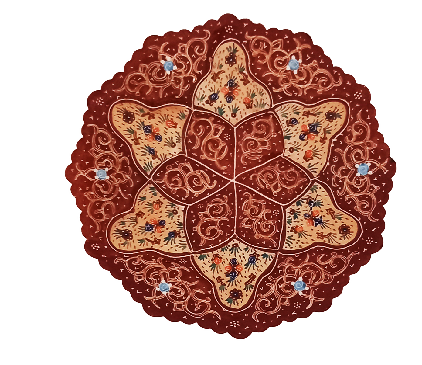 - Источник тепла и уюта. Глубокие оттенки коричневой и кофейной эмали выглядят по-домашнему тепло и «вкусно». Сложный узор с коричневым цветком в центре, обрамленным кофейными лепестками и изящными голубыми акцентами, притягивает взгляд и создает ощущение гармонии.